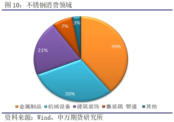 不锈钢下游主要包括金属制品、机械、建筑、电力、交通运输等方面。随着消费能力的提高及高端制造产业结构升级,不锈钢在消费市场的应用潜力有望不断被挖掘,在普通碳钢应用领域的替代趋势逐步呈现。