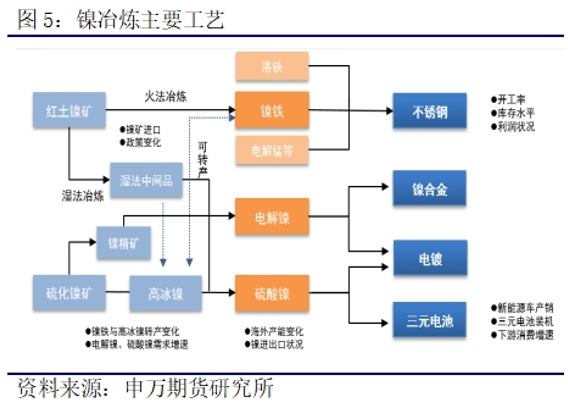 镍产业链各环节中,最主要的供需路径为红土镍矿火法冶炼-镍铁-不锈钢。但随着新能源汽车的蓬勃发展,下游动力电池对硫酸镍的需求增速显著。因此,红土镍矿湿法冶炼-湿法中间品-硫酸镍-动力电池的路径重要性逐步显现其优势。