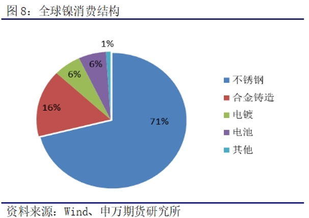 镍产业链下游中,主要广泛应用在钢铁、镍基合金、电镀、电池等领域。传统领域,镍主要用途在于生产不锈钢,镍的抗腐蚀性,使得其成为一种重要的钢材添加剂。镍的抗腐蚀性佳,也常被用在电镀上,镍镉电池含有镍元素。