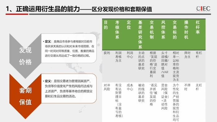 第一个能力就是正确的运用衍生品的能力,本质上是要一定要区分发现价格和套期保值。那么现在客观的来说,绝大多数的产业公司,他是知道我应该用衍生品来为我服务,但是他不知道到底衍生品能够帮我做什么事情?