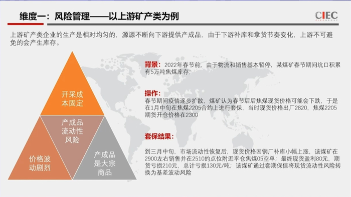 第一个就风险管理的例子,比如说一个上游的矿产类企业,理论上获得一个企业的一个成本是固定的,但是成品是源源不断的,只要开采,源源不断要出去的。那么在有的时候,下游流通性如果出现问题的时候,坑口就会积累一些库存。那么这是做了一个焦煤的例子,焦煤因为流动性出现问题,有可能出现绝对价格的风险,通过套期保值的方式把它转化成基差的风险。他把绝对价格的风险转成基差的风险以后,使得他的风险就变小了。