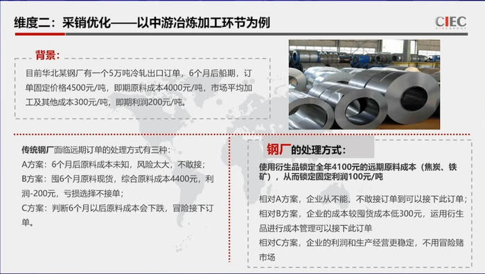 实际的产销优化应该是已经做到非常的复杂了。因为这是一个单纯的标准品的采购例子。那么实际的过程当中,我们需要的采购,第一个是有不同的采购主体,第二个有不同到货时间,有不同的规格差异、区域差异。如何建立一个有效率的采购中心,这个是我们衍生品有可能帮他做的事情。