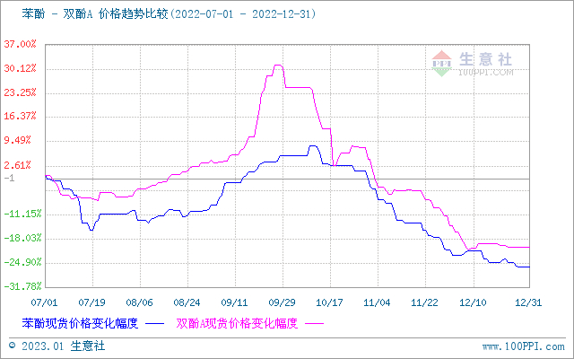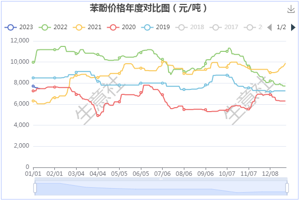 下半年依然是多重因素叠加影响苯酚市场价格。一方面下半年高昂的成本下工厂亏损严重,酚酮企业亏损到2000元/吨,部分企业不得不停车检修,且9月份台风冲击下,苯酚市场推涨心态积极。另一方面,下游双酚A新增装置投产,消化一部分原料后,苯酚市场流通量紧张,持货商惜售情绪增加,据生意社数据,国庆节后苯酚市场推涨至11310元/吨,脱离了成本面的支撑,在供应利多加持下市场再度推至年内高位,但继续上行动力不足,四季度随着进口货源大量补充,而需求端随着终端需求下滑,市场一路下行,年底跌至低谷,12月31日全国市场均价在7675元/吨。
