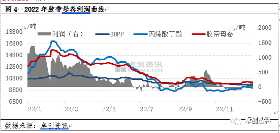 2022年胶带母卷市场价格走势呈现震荡下跌状态,尤其年中期间,价格下跌速度较快。以华东胶带母卷为例, 2022年均价为12066元/吨,同比下跌2698元/吨,年内最低月均价出现在11月为9894元/吨,较最高月均价下跌5374元/吨。其价格走势背后最大的逻辑是下游需求的萎缩以及原料下滑带来成本面的拖累。2022年胶带母卷下游库存压力缓增,对胶带母卷采购降低,同时胶带母卷新增投产释放,供需矛盾突出,对市场价格持续施压。