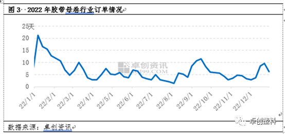 2022年胶带母卷行业需求降低,根据卓创资讯调研,厂家累积订单情况来看,截至12月最后一周,厂家累积订单为6.27天,较2021年同期减少1.3天;从年内厂家周度厂家累积订单来看,胶带母卷厂家长期处于低订单状态。