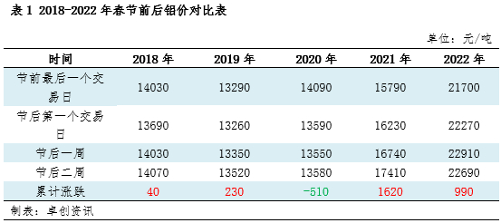 就节后铝价走势来看,回首过去五年来国内铝价的走势,近两年铝价在节后首个交易日出现上涨,而节后一周内有三年出现上涨,而二周后有四年时间铝价是出现上涨的。尤其近两年来,铝价在节后上涨走势较强。另外,今年下半年铝价走势逐渐回归平稳,也为预判节后铝价提供较好的参考。