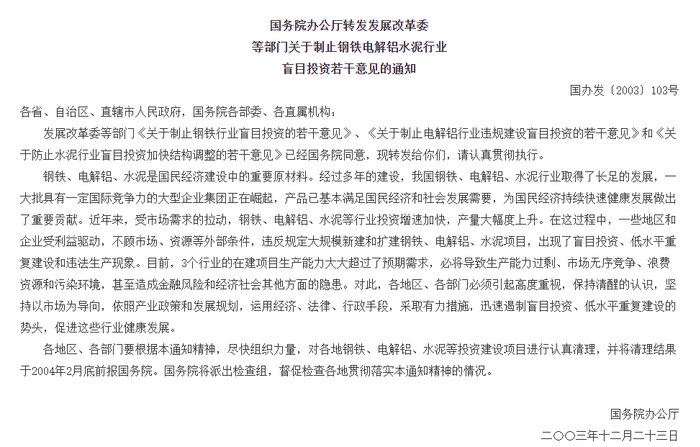 2003年12月23日,国务院印发《国务院办公厅转发发展改革委等部门关于制止钢铁电解铝小泥行业盲目投资若干意见的通知》,要求各地运用多种手段,迅速遏制盲目投资、低水平重复建设的势头。