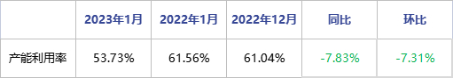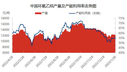 隆众数据统计,截止 2023年1月28日,中国乙烯产能利用率为55.81%,较春节前上升1.05个百分点,节间环氧乙烷价格触底,下游抄底生产订单,开工率尚可,对环氧乙烷保持正常接单,三江18万吨/年装置重启,负荷逐步提升中。
