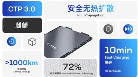 2022年6月23日,宁德时代举行“麒麟电池,推陈出新第三代 CTP 技术新闻发布会。麒麟电池使用的是第三代CTP技术,电池系统集成度创全球新高,体积利用率突破72%,能量密度可达255Wh/kg,轻松实现整车1000公里续航,计划2023年量产上市。