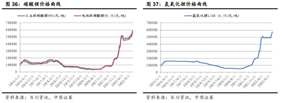 2022 年,中国新能源汽车销量约690 万辆(+96%),中国市场表现强劲超出早先预期。新能源汽车销量高增长延续,产业链上大多数环节仍然保持景气高涨。然而随着2023 年新能源汽车销量增速放缓,锂电上游资源品比如锂矿的价格将进入下行的再平衡阶段。