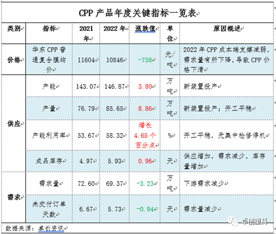 2022年CPP行业关键指标来看,供应量的增加和需求量的减少导致行业供需矛盾继续加深,出现价格和利润双弱的局面。具体来看: