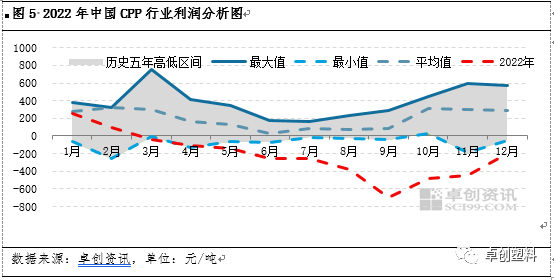 2022年中国CPP行业平均利润在-222元/吨左右,较2021年平均利润下跌342元/吨,较2018年平均利润下跌427元/吨。利润高点出现在1月约251元/吨,低点在9月约-695元/吨。一季度利润多处成本线上方,4-10月维持负利润状态。