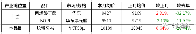 本月胶带母卷市场价格震荡上涨,价格重心较上月上涨。本月胶带母卷跟随成本变化明显,成本在月初出现下滑,对胶带母卷支撑不佳,叠胶带母卷市场清淡需求的氛围,市场价格在月初期出现下滑,随着成本上涨,胶带母卷跟涨;节后归来,原料丙烯酸丁酯及BOPP均有上涨操作,胶带母卷生产成本继续增加,厂家低价出货意愿降低,有跟涨原料上涨想法。截至1月29日,胶带母卷华东市场10200-10500元/吨;山东市场10200-10400元/吨,华北地区10200-10500元/吨;东北地区10100-10300元/吨;华南0.53-0.55元/平方米。