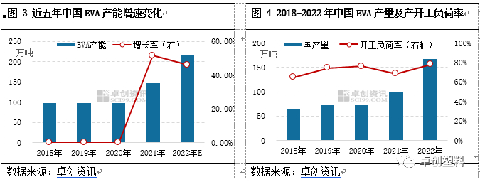 2022年EVA产量达167.55万吨,同比上涨66.29%。2022年EVA行业开工负荷率或在77.93%,同比去年提升9.48个百分点。一方面得益于新产能的投放或原有产能的扩能,与此同时2021年投放产能在2022年产能利用率明显提升,2022年EVA产出量明显增加。另一方面由于EVA利润好于LDPE,2022年LD/EVA切换产能增加EVA产出量,致使EVA产能利用率提升。