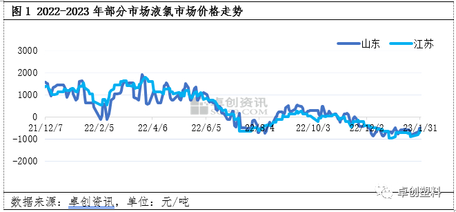 春节前后液氯市场价格反差较大,节前(1月初至1月20日)多数液氯市场价格下滑,以山东市场为例,节前1月20日山东槽车液氯市场价为(-900)-(-750)元/吨,均价-825元/吨,较1月3日收盘价(-500)-(-450)吨累计下跌400-300元/吨,均价下滑73.68%。而节后多数市场价格出现上涨,山东、河北、河南、江苏、安徽、东北、内蒙古地区液氯价格均有不同程度的上涨,山东地区春节假期期间价格也有上涨,节后价格有进一步上行,截至1月31日,山东槽车液氯市场价为(-500)-(-450)元/吨,均价-475元/吨,较节前累计上涨400-300元/吨,均价上涨42.42%。