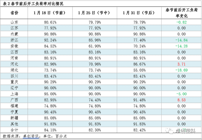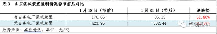 据卓创资讯跟踪,春节期间有2家企业停车,约有8家企业降负荷运行,其他氯碱企业均维持前期生产状态。而春节结束后,除停车企业恢复正常生产外,前期降负荷企业暂无提负荷计划。目前局部地区受液碱成交不佳、价格存下跌预期影响暂无提升开工负荷率预期。如表中春节前后开工负荷率对比情况,可以看到春节期间开工负荷率略有下调,主要是因为有部分企业因春节效应影响,停车或者降负荷运行,而春节结束后,开工负荷率略有恢复,主要是因为前期因春节原因停车企业恢复开车,但因部分降负荷运行企业暂未提负荷运行,且有氯碱装置年后安排检修,因此开工负荷率提升幅度较为有限。