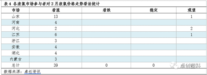 从上表来看,各个市场的参与者对2月份液氯价格走势的看法较为一致,多数市场参与者持看涨态度,少数市场参与者持观望态度,持看涨态度的共有39位,占比约91%。目前液氯下游开工逐步恢复,部分市场下游开工恢复程度较高,预计2月中旬结束前多数下游开车,在需求好转预期下,价格上涨的可能性较大,但液氯市场变动较为频繁,出于对未来不确定因素及三月份会议影响的考虑,少数市场参与者谨慎观望。