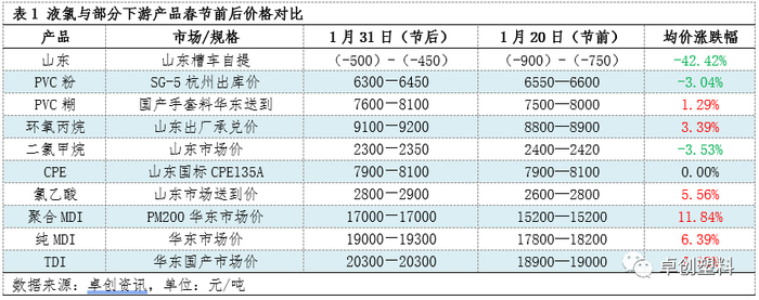 从液氯与下游产品春节前后的价格对比来看,除PVC粉和二氯甲烷节后价格下降、CPE节后价格未调整,其他下游产品节后价格均较节前上涨。节后部分市场液氯价格上涨,从成本端给予下游产品价格一定支撑,加之下游产品本身供需调整,多数下游产品价格上涨。
