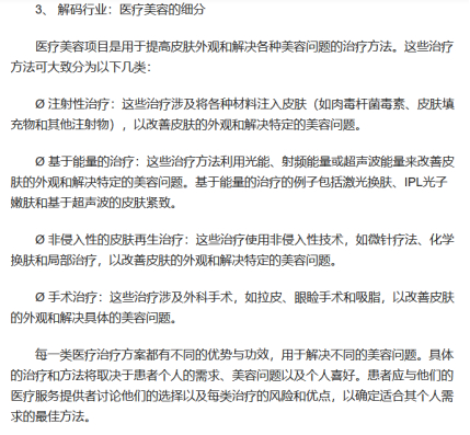 而在每个小标题下,又是极为清晰的详细内容介绍,比如在医疗美容细分领域,又被分为注射型治疗、基于能量的治疗、手术治疗等等,并列出了每类治疗的风险和优点: