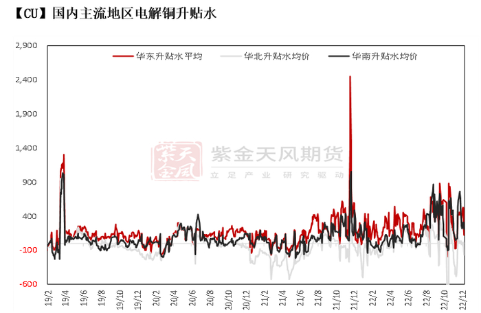 2022年12月,中国铜矿砂及其精矿进口210.3万实物吨,同比增加2.09%,2022年1-12月中国铜矿砂及其精矿进口2531.8万实物吨,累计同比增加8.07%,进口量开始自11月创进口单月历史记录后高位回落。其中,中国铜精矿进口来自部分美洲国家(秘鲁、美国和巴拿马)达63.5万实物吨,环比减少16.6%,环比减量达12.66万实物吨。此前预计美洲发往中国的铜精矿数量很难再维持2022年11月进口数据那样的高位水平得以应验。2022年11月—12月南美部分国家生产端和发运端都遭受到不同事件和不同程度的冲击,叠加中国炼厂冬储备货接近尾声,直接导致2022年12月铜精矿进口环比和增量数据由增转减。
