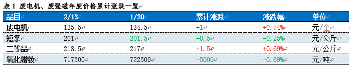 春节前腊月二十过后市场基本开启假期模式,节前市场价格变动幅度有限,节后正月初七左右市场各环节陆续恢复交易,将近两周的交易时段内废电机、废强磁等整体走势偏强,不过上周三开始市场预期有所改变,市场报价稀少、部分品种价格较节前累计下降,具体价格统计如表所示。