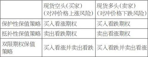 期权套期保值是指配合期货或现货的头寸,用期权头寸的收益,弥补现(期)货可能出现的损失,以达到锁定或降低价格风险的目的,包括保护性(买入期权)保值策略、抵补性(卖出期权)保值策略和双限(买卖期权)保值策略。