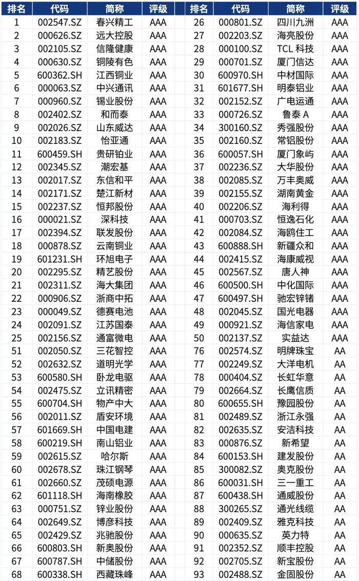 表3: 2021年衍联中国上市公司套保评级排行榜(Top 100)