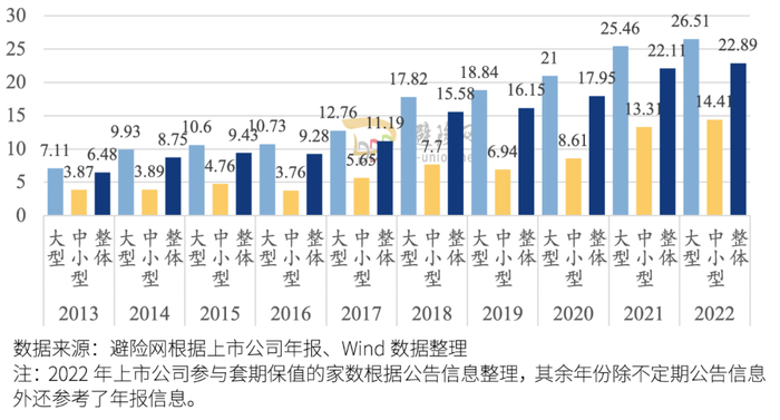 A股上市公司套期保值的发展,不仅仅体现在参与套期保值的上市公司数量的上涨上,还体现在上市公司套期保值参与率的显著提升上。本《白皮书》用参与套期保值的实体行业A股上市公司的数量在实体行业A股上市公司总数中的占比来度量上市公司套期保值参与率。避险网数据显示,A股上市公司套期保值参与率由十年前(2013年)的6.48%提高到了2022年的22.89%,其中大型企业的套期保值参与度由十年前的7.11%提高到了2022年的26.51%,中小型企业的套期保值参与度由十年前的3.87%提高到了2022年的14.41%(见图3)。
