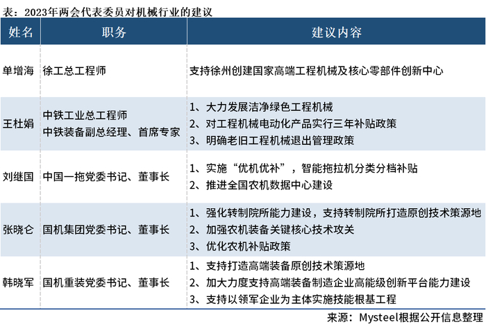 今年两会机械行业主要聚焦哪些方面?Mysteel汇总了2023年两会代表委员们对机械行业的建言。经整理发现,在机械行业的建言献策中,打造国家高端装备创新基地、工程机械电动化、工程机械和农机补贴、农机数据化、农机装备技术攻关等成为高频词。详细内容如下: