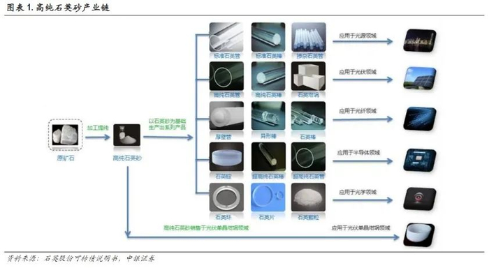 从产业链上看,高纯石英砂被广泛用于光伏、电子、高端电光源、薄膜材料、国防科技等领域,是高端制造行业不可替代的原辅材料。