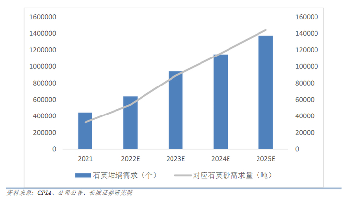 其中,石英坩埚为光伏级高纯石英砂的主要制品,用于制备硅片,是单晶硅生长炉的组成部分。长城证券于夕朦等在2约2日研报中表示,光伏放量预期下,需求火热持续,测算2022-2024年光伏单晶硅领域需求石英坩埚6.39、9.44、11.48万个