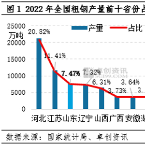 从以上发布的各种行动计划及方案可以看出,2018年以来山东省钢铁工业发展按照规划目标层层推进。从产量规模来看:山东省是继河北、江苏、后全国排名第三的钢铁大省。对比山东粗钢产量数据,2019年山东省粗钢产量下滑了820万吨,全国产量占比降低至6.39%,这也是10年来最低占比水平,全国产量排名也被辽宁超越位居第四位,但其他年份山东粗钢产量占全国粗钢产量的比重虽有所波动,但均保持在 7%以上,是我国重要的钢铁生产基地。2018年底山东省钢铁总产能在9000万吨左右,在粗钢压减目标下,2022年山东省严格把全年粗钢产量控制在7600.3万吨以内,但仍居于全国第三位,其中电炉钢产量占比达到10%左右。