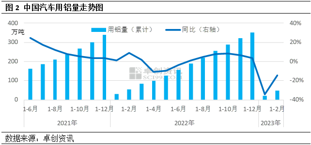 根据卓创资讯监测数据显示,2月份,国内汽车市场用铝量为26.42万吨,环比增加27.48%,同比增加12.08%;1-2月份,国内汽车市场用铝量为47.15万吨,同比减少14.38%。2月份,春节过后汽车市场逐渐恢复,汽车产销基本恢复到正常水平,受到部分地区及部分品牌政企双向补贴的刺激以及新能源汽车持续降价的提振,整体汽车市场数据显著提升。且汽车市场整体降价潮仍将持续,更低的价格将会持续推动市场保持较好发展形势。