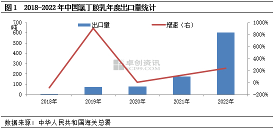 同时,国内氯丁胶乳出口量整体偏少,根据海关数据显示,2018-2020年中国氯丁胶乳出口量不足百吨,而2021-2022年受国外装置停车检修时间相对较长影响,中国氯丁胶乳出口量呈现翻倍增涨,2022年中国氯丁胶乳出口量达600多吨,同比增加241%附近。