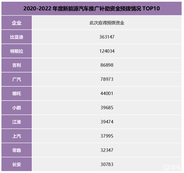 此外,2020—2022年度新能源汽车推广应用补助将预拨付补贴资金115亿元。其中,比亚迪拿到预拨付资金36亿高居榜首。