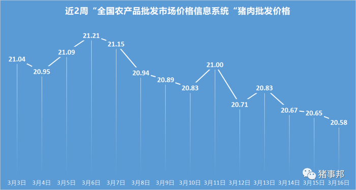 据农业农村部“全国重点农产品市场信息平台”监测数据,3月16日全国农产品批发市场猪肉平均价格为20.58元/公斤,环比下跌0.3%,同比上涨13.7%(去年同期猪肉批发价格18.10元/斤)。
