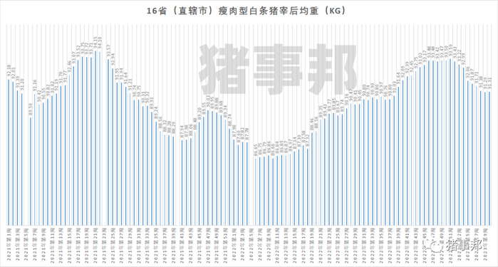 据农业农村部信息中心监测,2023年第10周(即2023年3月6日-3月10日),16省(直辖市)瘦肉型白条猪肉出厂宰后均重 91.31公斤/头,较上周微涨0.02公斤/头。这是生猪宰后体重在连续9周下跌后,首次小幅微涨。