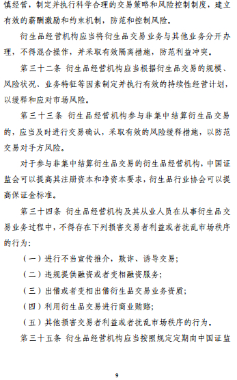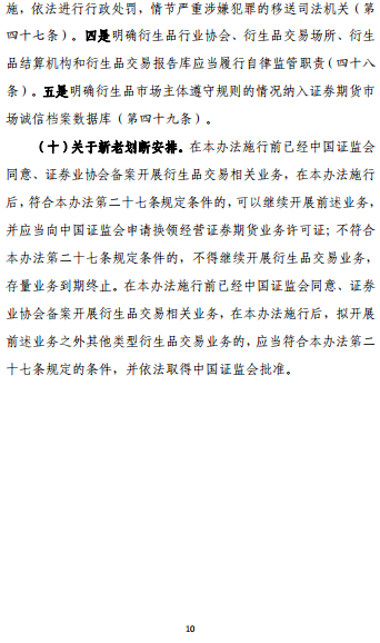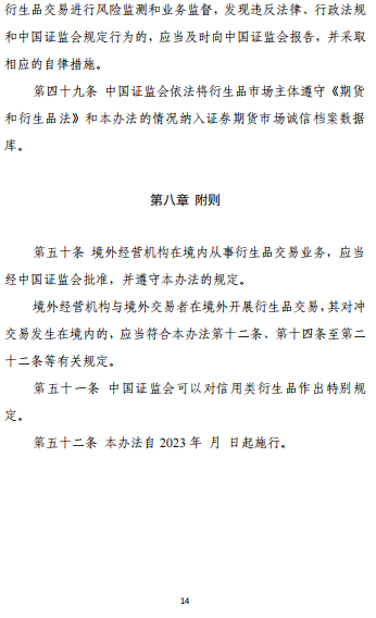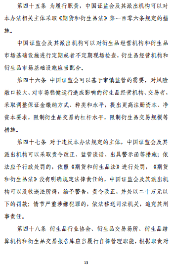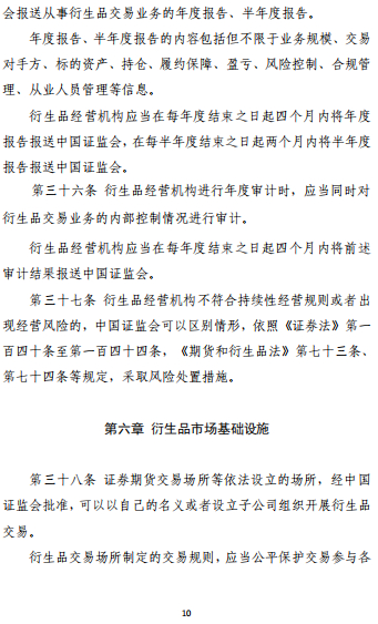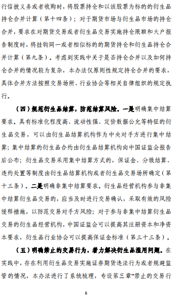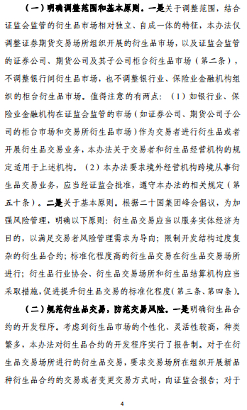 这是一部贯彻落实期货和衍生品法、统一规范证监会监管的衍生品市场的规章,进一步明确了衍生品交易监管框架和监管思路,对我国多层次资本市场建设具有里程碑式的意义。监管部门下一步或出台配套细则,进一步完善衍生品市场法规体系。