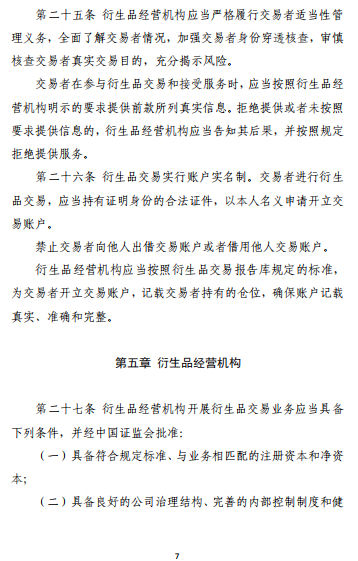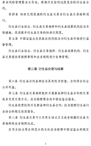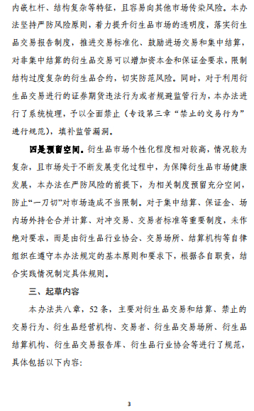 关于基本原则,《办法》第二条明确,衍生品交易应当以服务实体经济为目的,以满足交易者风险管理需求为导向;限制开发结构过度复杂的衍生品合约;标准化程度高的衍生品交易在衍生品交易场所进行;衍生品行业协会、衍生品交易场所和衍生品结算机构应当采取措施,促进提升衍生品交易的标准化程度。