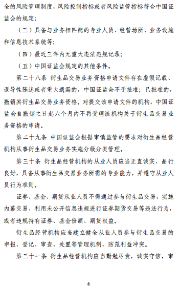 《办法》第二十九条明确,中国证监会根据审慎监管的要求对衍生品经营机构从事衍生品交易业务实施分级分类管理。