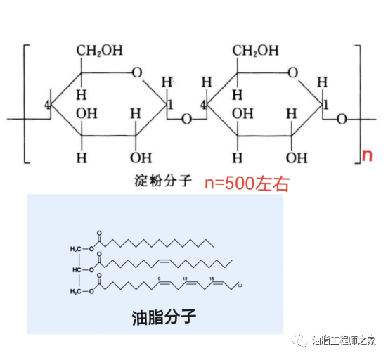 碳水化合物和蛋白质都属于高分子聚合物。人们常吃的面粉和大米中的淀粉分子量高达10万以上,蛋白质的分子量更高达几十万。而油脂的主要成分——脂肪酸甘油三酯则是单分子有机物,分子量在1000左右,只有淀粉,蛋白质分子量的0.1%~1%之间(以下是淀粉和油脂的分子结构对比图):高分子化合物必需要经过复杂的降解为程过程,成为小分子或单分子才能被人体吸收,与此同时人体需要消耗相应的能量,付出沉重的代价。而油脂本身就是单分子不需要降解过程。