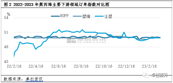 进入2023年国内聚丙烯供应端变化明显,一方面新增产能冲击,2023年至今新增广东石化50万吨、海南乙烯一线20万吨及二线30万吨共计100万吨产能释放。另一方面成本压力下,生产企业降负荷生产以及检修安排增加。据卓创资讯估算2023年1-2月PP累计产量在502.18万吨,较去年同期下滑0.14%。总体来看,供应2023年初至今未见明显压力。