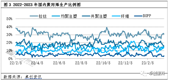 目前2023年新增产能稳定生产拉丝对市场拉丝供应冲击力度较大,而在成本以及新增产能冲击下,企业择机排产选择尤为重要。从卓创资讯统计的排产比例来看,2023年开始企业在拉丝的排产上多维持在30%以下的较低水平,而共聚注塑的排产一直维持在17%以上的较高水平,这也从供应端上造成了两者之间的差异。