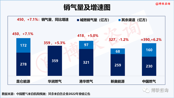 2022年,全国天然气表观消费量为3663亿方,与去年同期下降1.7%。五大城燃,除新奥外,其余4家均呈现正增长,远好于大盘,基本保持处于320-440亿方之间。