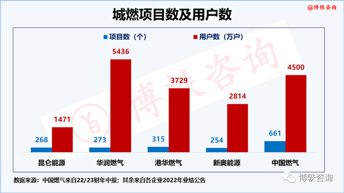 截至2022年底,五大燃气集团的城燃项目数均超过250家。中国燃气项目数高达661个,最低为新奥能源254。用户总数,除昆仑能源外,其余4家均在2800万以上。