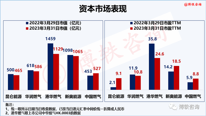 与去年同期相比,仅中国燃气市值表现有所回升,涨幅为16%;新奥能源的市场表现也是相比平稳;而港华燃气市值回落最大,市值蒸发超300亿元。市盈率方面,昆仑能源、华润燃气、中国燃气在10倍左右;港华燃气、新奥能源则是在20倍左右。
