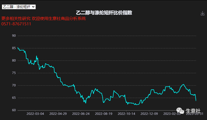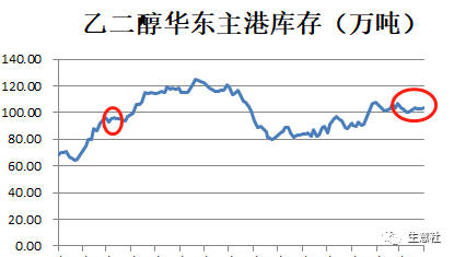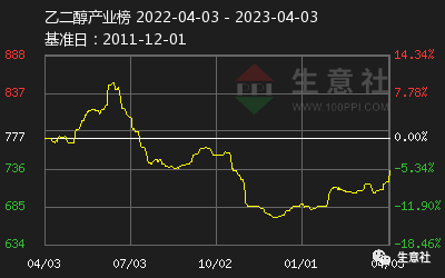 据生意社数据显示,截止2023年4月3日,乙二醇华东主港库存为103.35万吨,较去年同期上涨3.8%,2023年1月中下旬以来,一直在100万吨上方震荡,整体处于相对中高位水平。