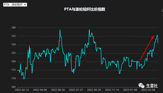 乙二醇与短纤的比价指数显示,目前处于比价指数低位水平,乙二醇对下游产品短纤成本面支撑相对较弱。聚酯的另一主要原料PTA对短纤价格支撑相对强劲(换言之,PTA对下游价格的影响因子较大)。PTA与短纤的比价指数显示,近期比价指数前期呈现上升态势,PTA与短纤存在“水涨船高”效应。