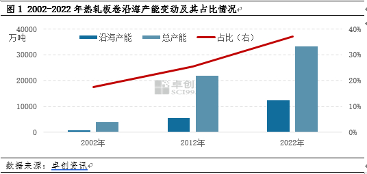 中国热轧板卷行业发展呈现起步晚,发展快的特点。自2002年以来,热轧板卷行业产能扩充近9倍,到2022年,热轧板卷产品成为全国第二大钢材品种,占比达到26.5%,仅次于螺纹钢。近二十年热轧板卷产能分布情况来看,主要特点有二,首先,全国产能持续扩充;其次,沿海产能占比逐渐增加。就卓创资讯监测全国热轧板卷产能情况,不难发现,2002年,热轧板卷全国总产能在3860万吨,沿海产能679万吨,占比17.59%。而到了2022年,热轧板卷全国总产能达到33386万吨,沿海产能12363万吨,沿海产能占比37.03%。近二十年沿海产能平均增速达到91.03%。可以说目前为止,热轧板卷沿海布局逐步形成。
