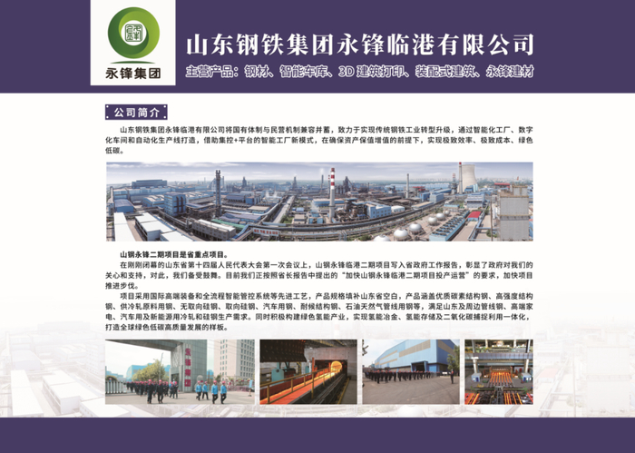 山钢永锋二期项目是省重点项目。在刚刚闭幕的山东省第十四届人民代表大会第一次会议上,山钢永锋临港二期项目写入省政府工作报告,彰显了政府对我们的关心和支持,对此,我们备受鼓舞。目前我们正按照省长报告中提出的“加快山钢永锋临港二期项目投产运营”的要求,加快项目推进步伐。项目采用国际高端装备和全流程智能管控系统等先进工艺,产品规格填补山东省空白,产品涵盖优质碳素结构钢、高强度结构钢、供冷轧原料用钢、无取向硅钢、取向硅钢、汽车用钢、耐候结构钢、石油天然气管线用钢等,满足山东及周边管线钢、高端家电、汽车用及新能源用冷轧和硅钢生产需求。同时积极构建绿色氢能产业,实现氢能冶金、氢能存储及二氧化碳捕捉利用一体化,打造全球绿色低碳高质量发展的样板。